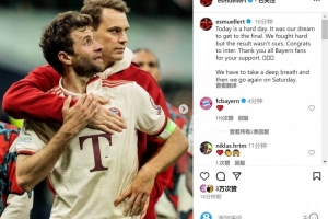 穆勒社媒写道:“今天是艰难的一天。我们的梦想是进入决赛,我们拼尽全力,但胜利不属于我们。祝贺国米,感谢所有拜仁球迷的支持。”
