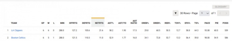 过去6场比赛,快船是联盟断档领先的最佳球队,最靠近他们的球队是他们下一场的对手凯尔特人,两队百回合净胜分差了10+。